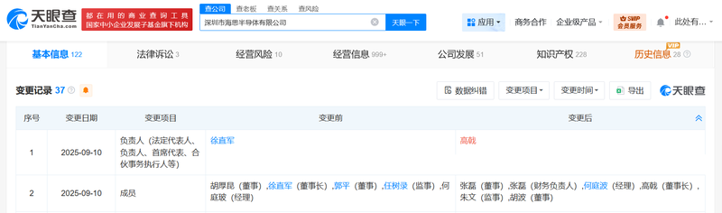 北京新闻Beike Finance(记者WEI Boya)Tianyan评论工业和商业信息,深圳Haisi Semiconductor Co,Ltd已在工业和商业上发生了变化,Xu Zhijun辞去了法律代表和董事长的辞职。同时,许多高级管理人员发生了变化。该公司成立于2004年10月,注册了20亿元人民币。它的业务覆盖范围包括半导体设计,开发,销售服务以及电子产品和通信信息产品的销售后,相关半导体产品的代理商,进口和出口电子产品业务以及通信信息以及支持组件。股东的信息表明,该公司充满了华为技术有限公司。深圳Haisi Semiconductor Co,Ltd。的工业和商业变化均涉及。照片/tianyan检查屏幕快照由Yang Juanjuan编辑的Mu x伊恩